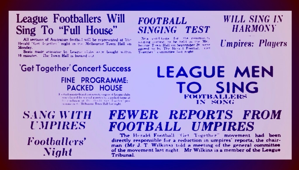 Who would have thought footballers and umpires singing from the same hymn page. I don’t reckon the Mordi Bloods or Frank Vergona ever did. From 1935 to 1940 a Melbourne Newspaper ran a very successful fundraiser The Herald Football “Get Together”. Money was raised for the Blanket Appeal. Poor families and the homeless were the beneficiaries helping them keep warm through Melbourne’s cold winters. I’m not sure, but it may have been a response to the after shocks of the Great Depression.