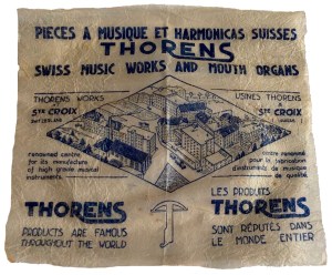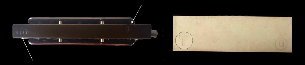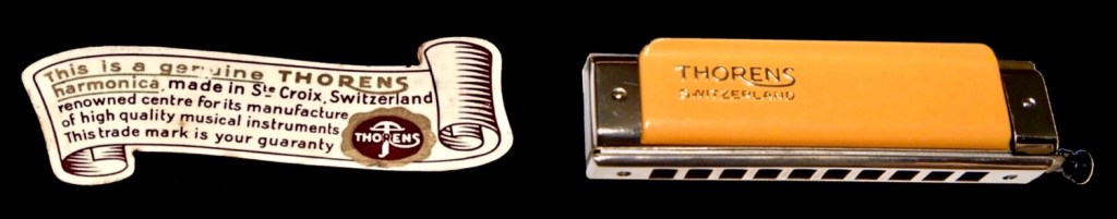 The Swiss Chromorgans are not distinctly marked ‘Thorens’, but the box and the back of the comb have a capital ‘T’ marked (see above). Also stamped on the comb is what presumably is the model number, 5305. I don’t know of too many harmonica makers in Switzerland and the longer button is distinctive of a ‘Thorens’.