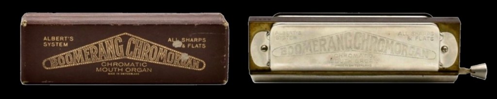 Pretty pleased to have stumbled over this beauty – a pretty slick Suisse Boomerang Chromorgan. This model and the Grand Chromorgan (there was no De Luxe model) were briefly produced in Switzerland after WWII. Albert’s Boomerang mouth organs were manufactured by Seydel, who were under occupation by communist Russia after WWII – so briefly Albert’s turned to Thorens in Switzerland to produce their Chromatics, at least for one year, 1949. Albert’s were probably keen to be up and about in the marketplace to compete against Hohner’s Chromatics, which had gained a strong foothold in Australia prior to the war. Hohner had been dealt a better hand being occupied by the French, and therefore increasing the likelihood of production for overseas markets. They too had similar issues to Seydel with shortages of material (primarily metal) for production and skilled workers. Then throw into the mix ‘Made In Germany’ stamped on the land Down Under harmonicas and you were certainly asking for trouble.