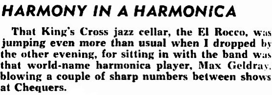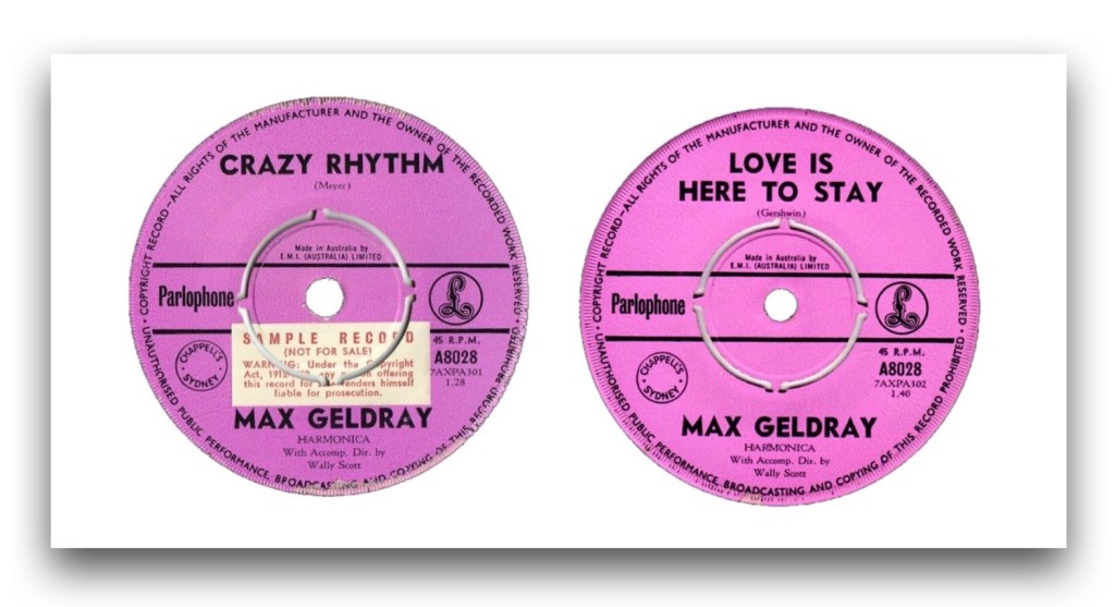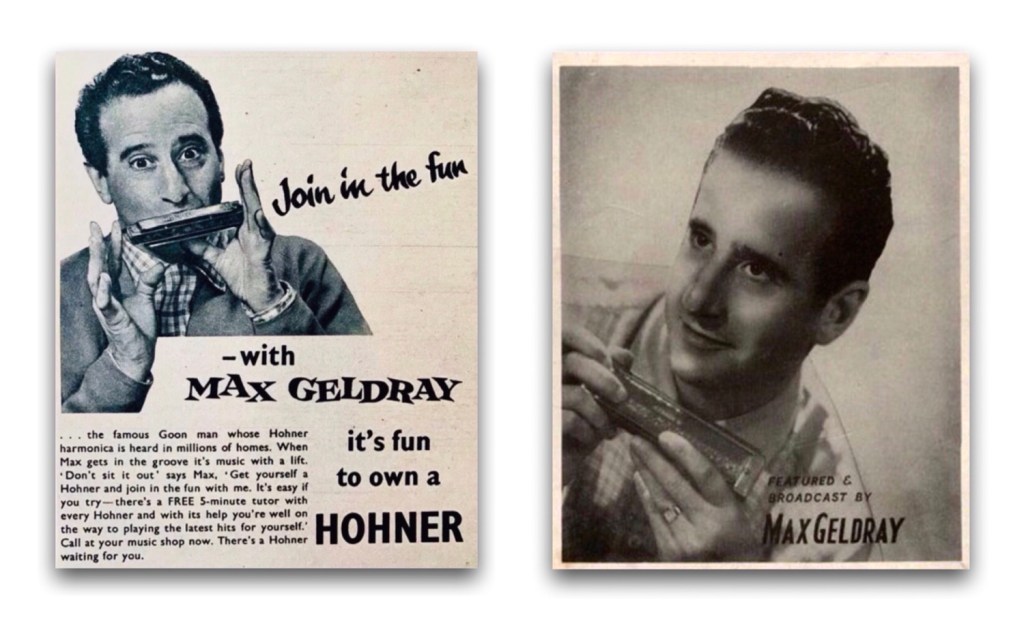 Max became an original cast member of The Goons Show when BBC producer and jazz fan Pat Dixon recruited Max into the shows format. Initially the program was titled Crazy People! Max stayed the journey performing on the BBC fiftieth anniversary and final show in 1972 – The Last Goon Show Of All. Speaking of crazy, Max would play out the Goon Show with his rendition of Crazy Rhythm, a swing tune originally written by Roger Wolfe Khan and Joseph Meyer for the 1928 Broadway show Here’s Howe. Interestingly Max’s version was pressed by Parlophone and released in Australia as a 45rpm single in 1961 – coinciding with his commitments down under. The main riff comes up pretty well on the old Ten Hole Tin Can (Diatonic Harmonica) – try it out.
