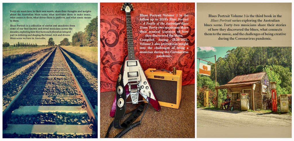 We sold out the first run of books and I tossed around the idea of asking other musician friends if they were interested in telling their stories. Because of my interest in the blues genre I decided on that as a theme, firstly, because blues always seems to be overlooked, and secondly I couldn’t find any books on the subject. So many people responded and were positive about the project so, long story short, I ended up with forty six people. A mammoth task which included interviewing, transcribing, editing, sourcing photos, permissions, doing the book layout etc. but wow, what an enjoyable project! So enjoyable I went on to do two more books, Volume 2 and Volume 3 with forty two people in each! I knew there were many more people that I hadn’t interviewed after the first one, so I decided to keep going. Lockdowns helped with that – all of a sudden everybody had time on their hands! I guess it all stems back to my passion for not only blues, but Australian music.