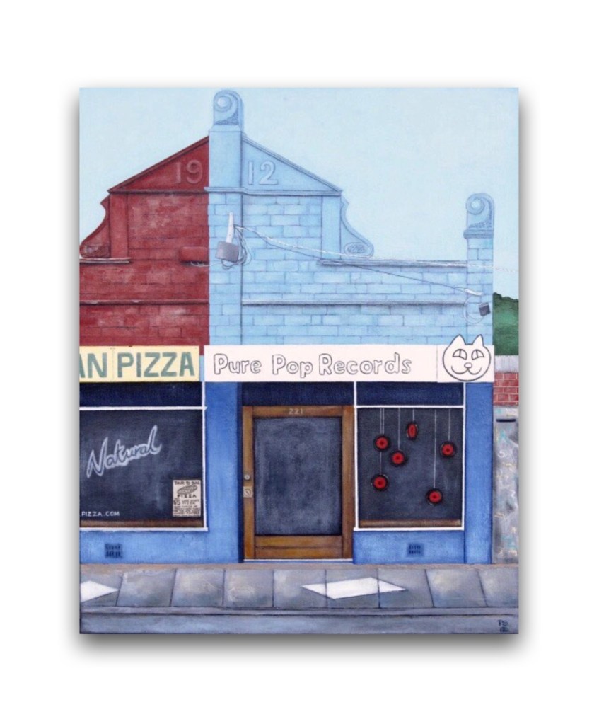 PB: Yes, venues are SO important! I have painted so many of them but unfortunately not the Bridge. One of my old haunts was the Edgy (Edgewater) in Mentone, another one I haven’t painted! I was a bit of a late starter and didn’t start painting until sixteen years ago when I turned forty. It was interesting when I spoke to Margret RoadKnight to hear the history behind the current Cherry Bar in Little Collins Street. It used to be Little Reata which was where a lot of folkies got their start. Just read your piece about the Bridge, those were the days! The desert boots made me laugh, everyone had a pair of those. I can remember going to a nightclub many years ago (can’t remember where maybe ‘Chasers’) wearing white boots and they wouldn’t let me in….I was told that “prostitutes wear white boots” ??!! That was a new one.