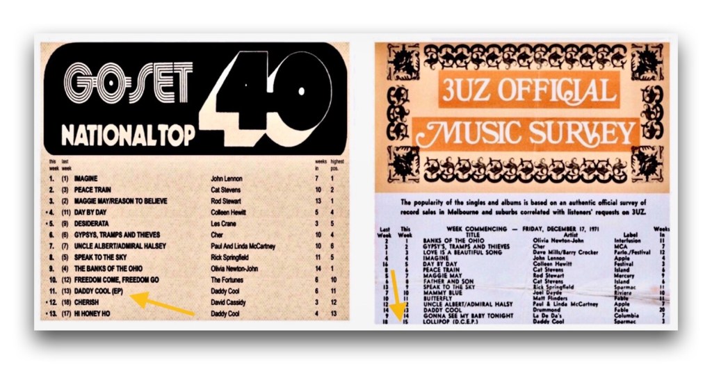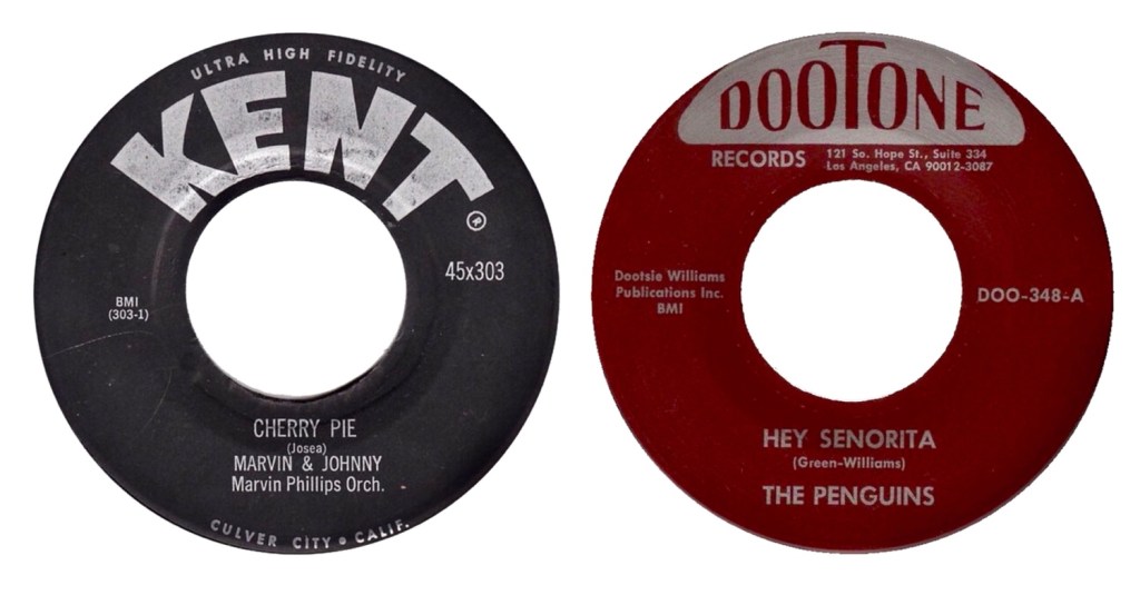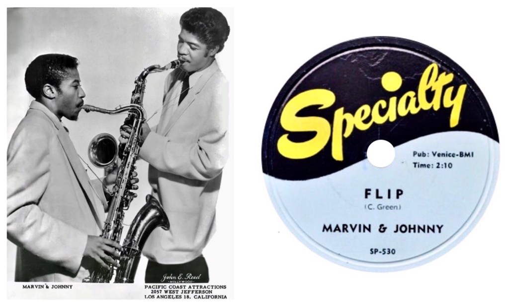 Just briefly on Marvin & Johnny – there was only one Marvin, Marvin Phillips, but there were quite a few Johnny’s (at least six) – none actually having the name Johnny! Marvin (pictured left on the photograph above) is seen here with the ‘Johnny’ who was Emery Perry. They were both saxophonists with the Richard Lewis Band. Carl Green, a one time Johnny, penned Flip and he belted out the vocal on their record. Daddy Cool had already covered a Marvin & Johnny tune on their debut album ‘Daddy Who? Daddy Cool’ – with perhaps the more familiar Cherry Pie. Interestingly they also covered a Carl Green tune on their comeback release of 2006, New Cool. The song in question is Hey Senorita, which was initially recorded by The Penguins.