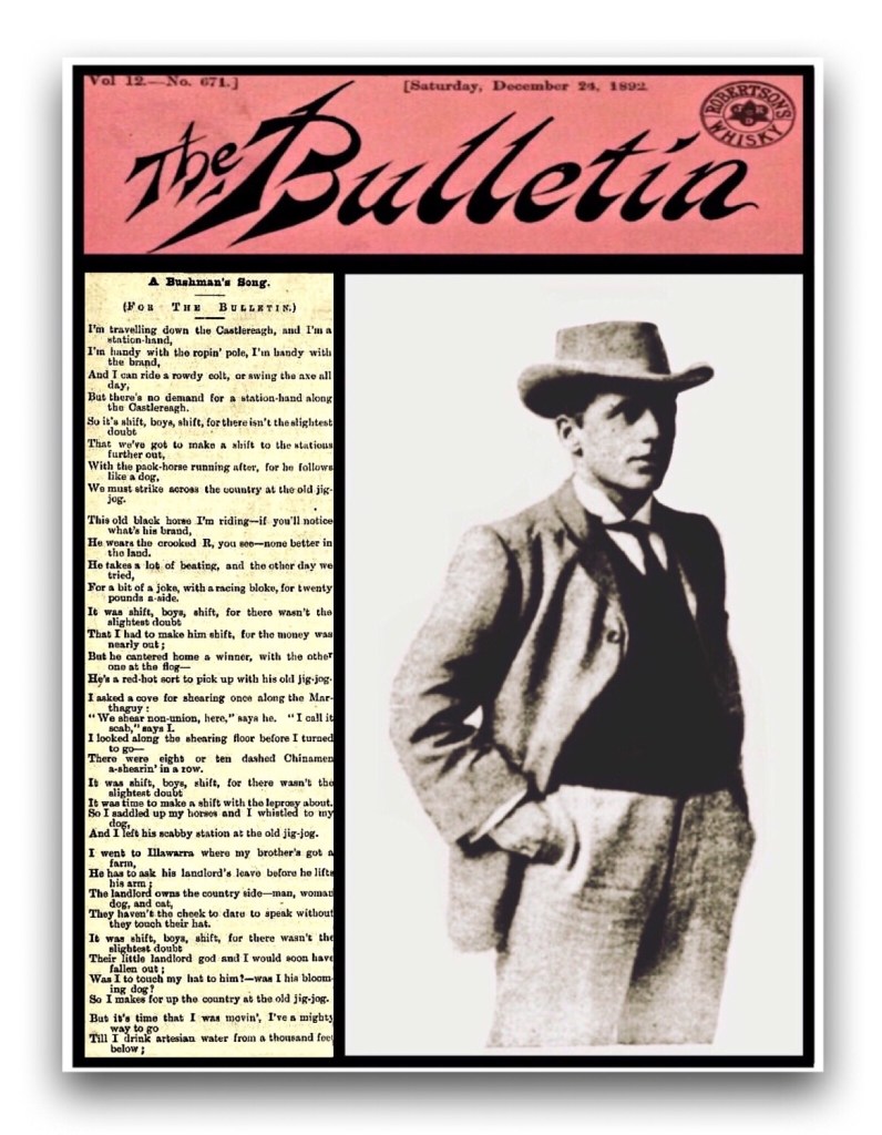Banjo (Andrew Barton) Paterson, noted Australian bush poet, penned this fantastic (every second line rhyming) poem in 1892 titled A Bushman’s Song first printed in The Bulletin. A tale about a Station Hand, a man of many talents, who is struggling to find union work and he devises a scheme to gain some money by means of a horse race.