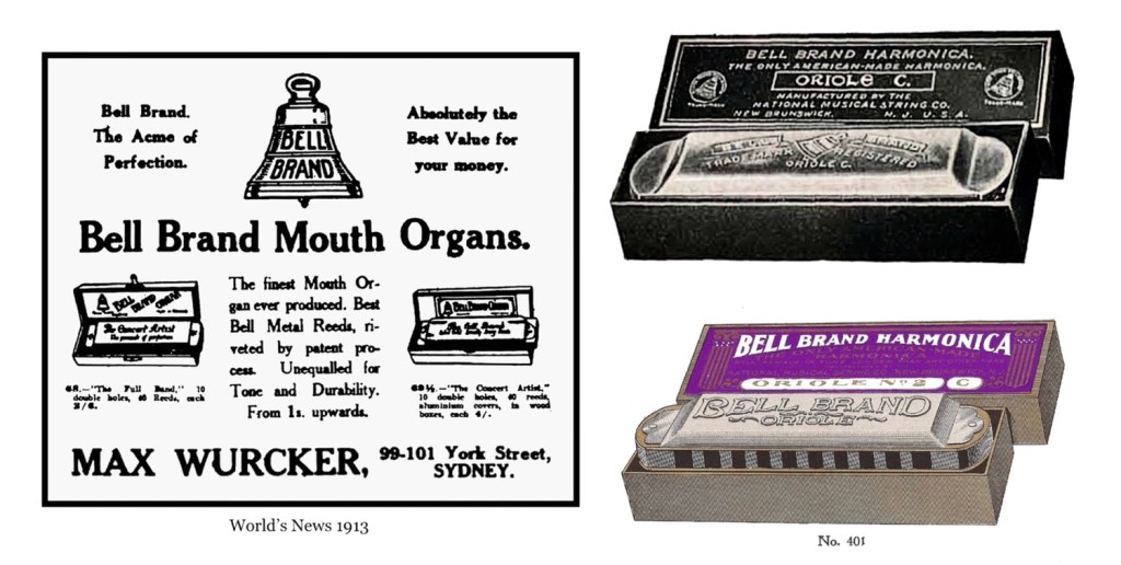 Max Wurker, of York Street Sydney, was selling the Bell Brand mouth organs made in America by The National Musical String Company of New Brunswick.