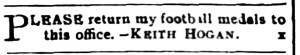 Phil Robins, from the Norwood Football club, posted a comment on the Hogan’s Heroes article providing another interesting fact. Keith mysteriously played one game for the Redlegs in 1913. The story continues to evolve. The Hogan family have also informed me that back in 2020, on a well known auction site, they were notified Keith’s 1910 ‘Best All-Round Play’, Warrior Football Club (Naracoorte) medal had been listed. Two of his medals had gone missing (most likely stolen? – they were nine carat gold) in 1913. Keith posted (and printed) a notice that year for their return in the newspaper where he worked.
