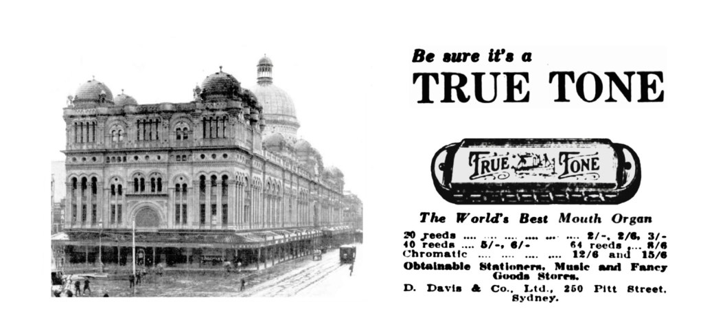 This author has unearthed another Aussie harp the True Tone and the fact it was produced for the Oz market is beyond reasonable doubt. Manufactured for D Davis & Co by, at first sight F A Bohm, but maybe not. In 1937 D Davis & Co were selling eight models that included; three ten holers (20 reeds), two twenty holers (forty reeds), a thirty two holer (64 reeds) and two chromatics – a forty reed and a forty eight reed. Eight years earlier, when D Davis & Co were in the Queen Victoria Building of George Street Sydney, they offered one less model (maybe only one chromatic). The earliest I could see them on sale was in December of 1924, just after D Davis & Co had their Trademark accepted. Three models were offered by E Paskins of High Street Maitland. You may remember an earlier discovery of The Rattler which D Davis & Co’s Sydney & Brisbane branches marketed as their own in 1906.