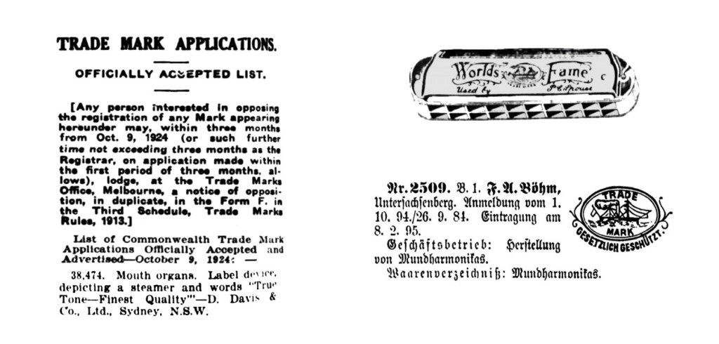 As per usual, I contacted the guru Pat Missin just for assurance on the manufacturer as the Steamship was slightly different to the usual F A Bohm trademark. Two steam funnels! Well did he throw a spanner in the works. He found the same trademark filed by Nicholson’s on the 19th March 1924. Please explain? The True Tone model pictured is very similar in both shape and design to F A Bohm’s World’s Fame P C Spouse signature model available from Mick Simmons. Here’s Pat’s take on the True Tone steamship. “I can’t help but wonder if it’s deliberate, as in they really wanted it to look like a Bohm at first glance. Really, they just changed the jib and added a second smokestack, maybe enough that Bohm couldn’t sue?” It also appears the slogan Finest Quality was ditched for The World’s Best Mouth Organ.