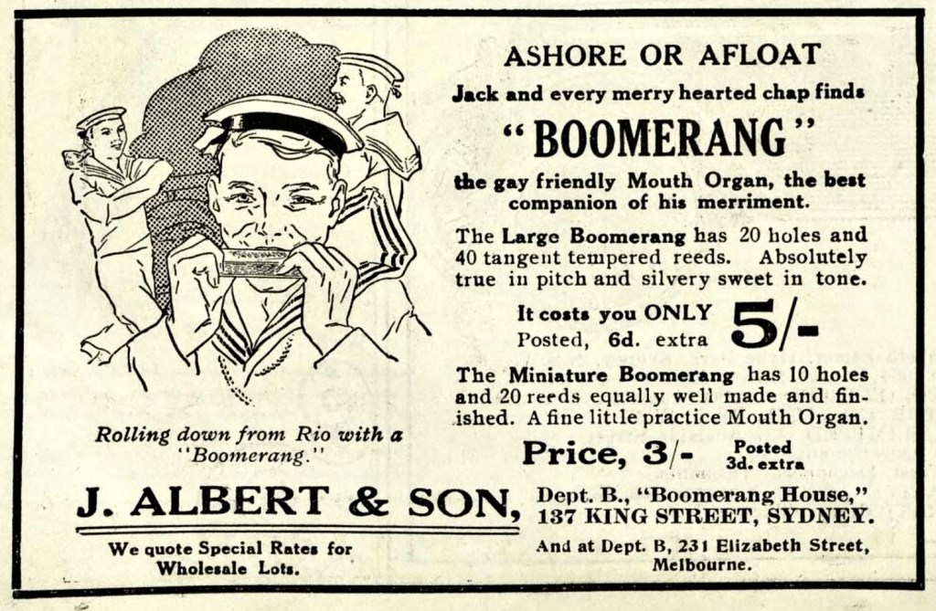 No love lost between Albert’s & Allan’s back in the day with regard to the advertising of their respective Mouth Organ brands. In this 1923 advertisement in The Bulletin (19th April) Albert’s had no problem in using a sailor and Jack reference for their Large and Miniature Boomerang Mouth Organ. Not sure how Crackajack and his mouth organs felt about this blatant use of their branding.
