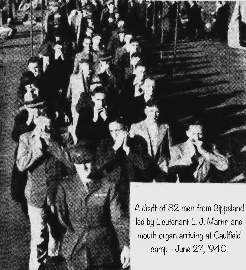 Marching Mouth Organ Band 1942Caulfield Racecourse Camp – 1941AIF working party Malayan jungle – 25th October 1941.Left: Gunner Fred Tonge serenades Aussie Actress Margaret Vyner(London 1940) . Right: Laban Chuter #354 13th Battalion NSW saved by his bible (some soldiers have been protected by their mouth organ) 1916.