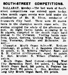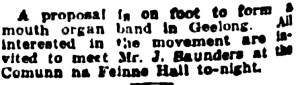 On Tuesday 17th January 1928 a call for mouth organists was placed in the Geelong Adveriser.