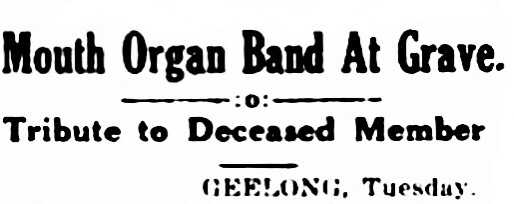 Members of the Geelong Mouth Organ Band paid their last tribute of respect to a former member of the band in a unique way today. At the funeral of Joseph Cameron, who was a member of the band for more than a year. The band, under the leadership of Mr Saunders played the hymn “Lead Kindly Light” at the mortuary chambers of Alex Monro, Ryde street. At the graveside at the Eastern Cemetery, where the Rev. T. Gault officiated, the band played the hymns, “Nearer My God to Thee” and “Lead Kindly Light.” This is probably tho first time in which a mouth organ band has officiated on such an occasion. (Riverine Herald, 8th January 1930)