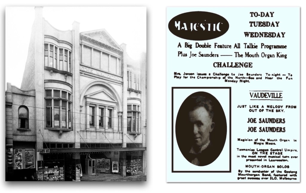 Joe’s Football officiating was required in the Apple Isle (Tasmania) in 1930. His solo mouth organ playing was also in demand. Joe featured on the bill at the prestigious Majestic Theatre in June of 1930. A local exponent, Mrs. Jensen, challenged Joe for the Championship of Tassie on one night. I couldn’t source the result – he must have won or it would have been front page news if he went down. The Tasmanian Examiner informed their readers of Joe and his mouth organ talents by stating, “unique entertainer with his simple instrument.” (17th June 1930)