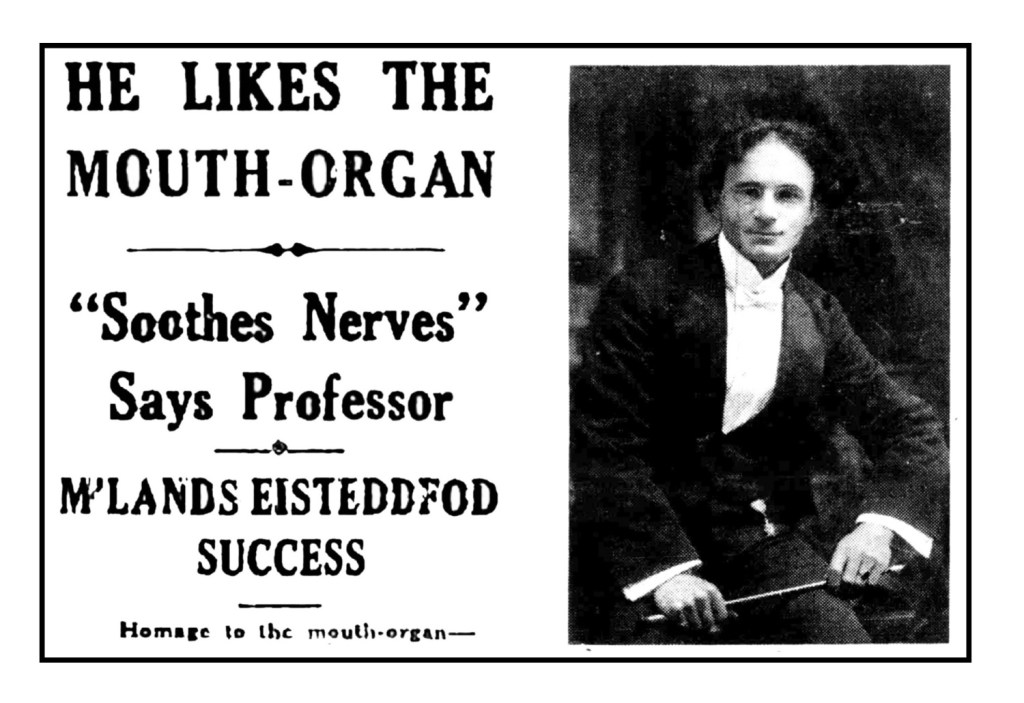 Homage to the mouth-organ the “bushman’s orchestra” – was paid by a professor of music at the Merrylands and Cumberland District Eisteddfod on Saturday. He was Professor C. Sauer, who carries the degree of A.Mus., and holds diplomas of Art at London, Paris and Sydney. “I love the mouth-organ because it has such a soothing affect on the nerves,” Professor Sauer told a large audience at the official opening of the eisteddfod during the evening. Psychiatrists, declared Professor Sauer, had advised him, if ever in the bush, to try the mouth-organ as a nerve tonic. “When I went to-the bush.” he said, “I tried it. I found the mouth-organ very soothing, and I got great satisfaction out of playing it.”. The eisteddfod, which is in-aid of the trust fund of the Merrylands Methodist Church, proved highly successful. More than 600 entries were received.