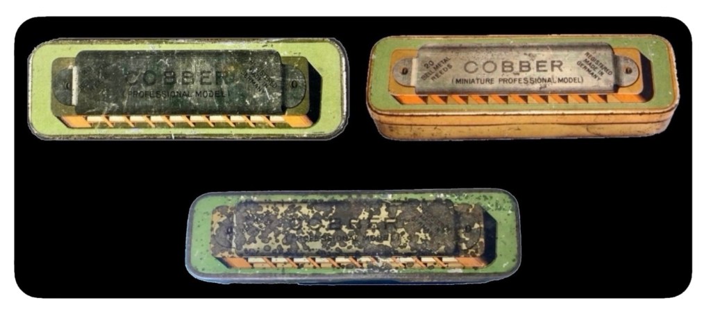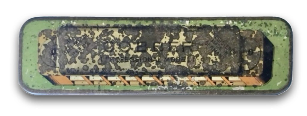 I’m often asked what I consider to be my prize possession. Although I have a very rare 1898 Hohner Up To Date Chromatic, a Koch Kangaroo and various Boomerangs and Crackajacks, I have to say this one hundred and ten year old Cobber Tin with all its patina fits the bill. Why? Well there’s something about harmonica tins with great graphics, then throw in its rarity and how I discovered this gem and there you have my reasons.