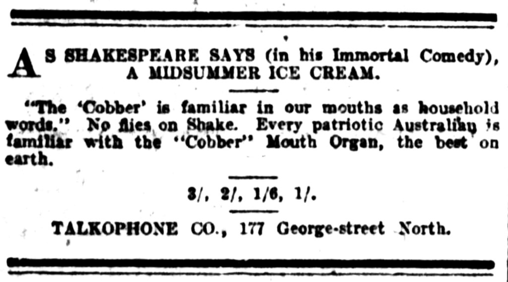 The Cobber did reappear in September 1936 as E Paskins of West Maitland had at least one. There is a possibility someone else trademarked the name (TM’s had to be renewed every ten years), but I’m leaning to this also being old new stock. This Cobber wasn’t readvertised in December. Paskins also offered other old models in 1936, the Woolloomooloo Warbler, Topnotcher, Moaphone, Coo-ee, Wallaroo, Possum and Kookaburra.