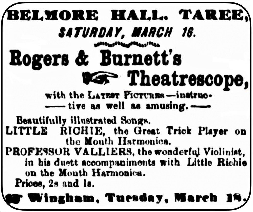 This is the only reference I could find of Little Richie, the great trick mouth harmonica player. In fact I only found one other reference for Rogers & Burnett’s Theatrescope where the company is referenced as being really good, and the pictures shown by electric light are absolutely devoid of flicker. Anyone out there in cyberspace a descendant of Richie?
