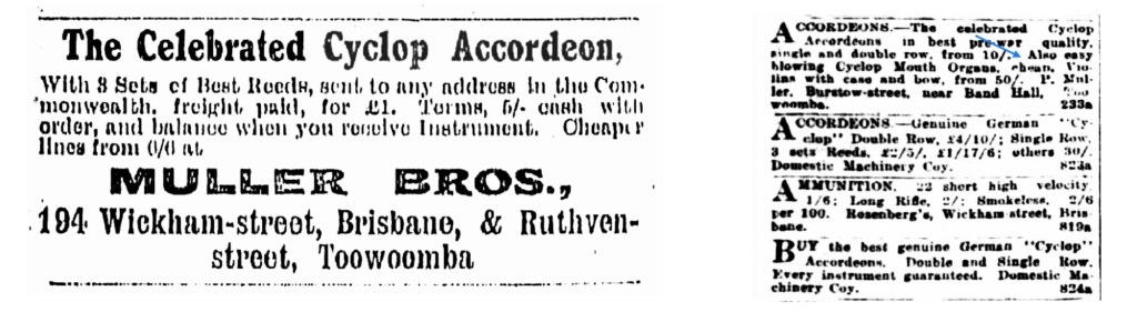 I spied with my little eye an interestingly monikered mouth organ advertised in Toowoomba 1923 (below right) – the “easy blowing” Cyclop.