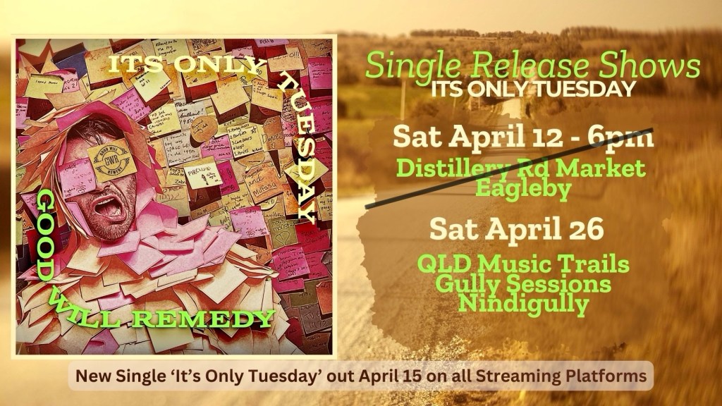 It is only Tuesday, but it’s the fifteenth and that means it’s Dawg Blawg day and appropriately the release of Good Will Remedy’s brand spankin’ new single It’s Only Tuesday. So this Toosday ain’t too bad. Kindly, the band presented yours truly with an early preview for review knowing our date of publication. Tuesday in days gone by (for me) was the preparation of next weekend’s match. These days it’s waking to Peej’s The Imaginary Friends Show – 3MDR (on what he labels as a shemozzle of a radio show) – pure entertainment from where I’m listening. And from then on, it’s only Tuesday. Tiresome Tuesday for many, but Taco Tuesday (& Tequilas) for some.