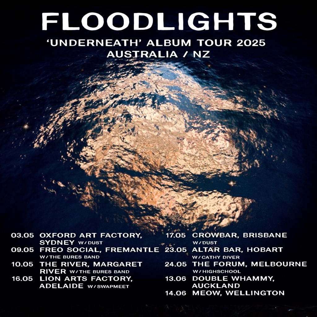 Melbourne band Floodlights have dropped their third album ‘Underneath’ and they have found their mojo (risin’). The addition of Sarah Hellyer has added a whole new dimension to their alt rock vibe. Her trumpet, keys and vocal shine bright. Songwriting duo Louis Parsons and Ashlee Keogh have looked inward (underneath) with tunes that resonate grief, memory, place and hope. Louis’ vocal tensions and timbre merge poetry into song and Ash’s melodic harmonica, a feature of previous releases, is prominent and ambient on JOY, Horses Will Run and Suburbia.