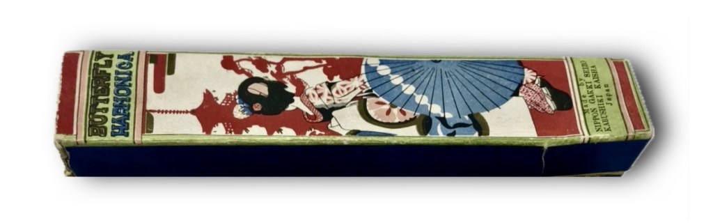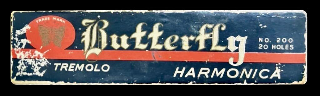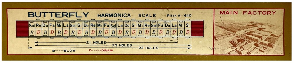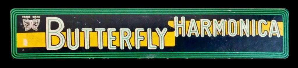 It’s difficult to date this 23 holer as it doesn’t appear a lepidopterist has done any leg work cataloguing these butterflies chronologically. Over a period of time there were a variety of different boxes for their Butterfly branded tremolos. There’s no doubt they were marketed for English speaking countries. The inside label from my recent acquisition, suggests a 21 hole and a 24 hole (Green & Gold box) was available too.