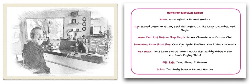 Peejy dropped in for another Huff’n’Puff that aired on Tuesday 20th May. The normal (what is?) shenanigans were on offer and even a Peejy tale regarding a science experiment gone wrong back in High School daze. There was no cigar in naming that riff, so I had to sing red gold and green! Sorry about that chief.