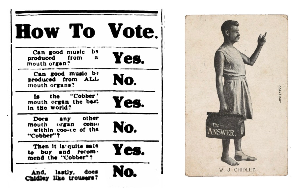 Cobber’s ‘How To Vote’ advertisement of 1913, was intriguing especially for the last response. Who the heck was Chidley and why wouldn’t he like trousers?