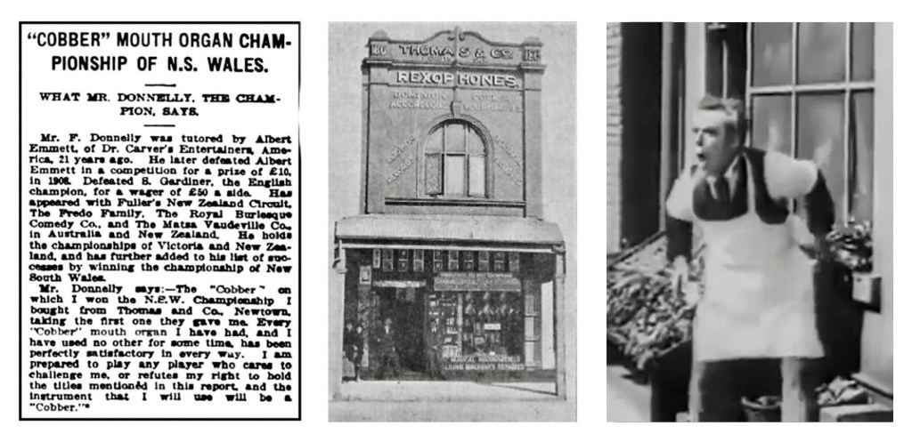 On the 18th December 1913 at the West’s Glaciarium (a skating rink and picture theatre), the Cobber New South Wales Mouth Organ Championship was held and won by a Mr. J Donnelly. Although the advertisement above has printed his initial as ‘F’ the one below is correct. Thanks to Ray Grieve, who in his revised publication of ‘Boomerangs & Crackajacks’ identified the man in question as American, James Donnelly.