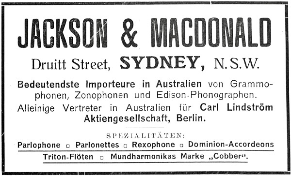 “Hi Shep. I think something happened before the war. Bauer and Krause specialised in import/export of various items, including textiles, toys and novelties. Their markets were Spain, Central and South America, India and Australia. Oddly, for what seems to be a busy and well established company, I’m not finding much in the way of trademarks beyond those for the Jackson & MacDonald stuff. Then within months of those, Jackson & MacDonald stuff trademark them all again in their own name and run this ad in the German trade press, claiming to be the biggest Australian importer of gramophones and stuff: