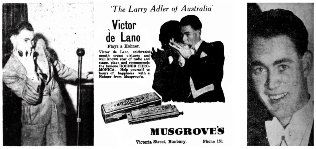 Victor de Lano. Harry Thompson from Sydney, who accompanied Tex Morton on early Regal Zonophone recordings. Left: Larry Adler with daughter Kate Lynn (2) in Oz. Right: Larry with two lads from the Melbourne Children’s Hospital. Guess who? Left: Don Chromatic Duo with John Don and 11 year old daughter Elaine (1949). Right: Master Walter … Continue reading Bibs & Bobs